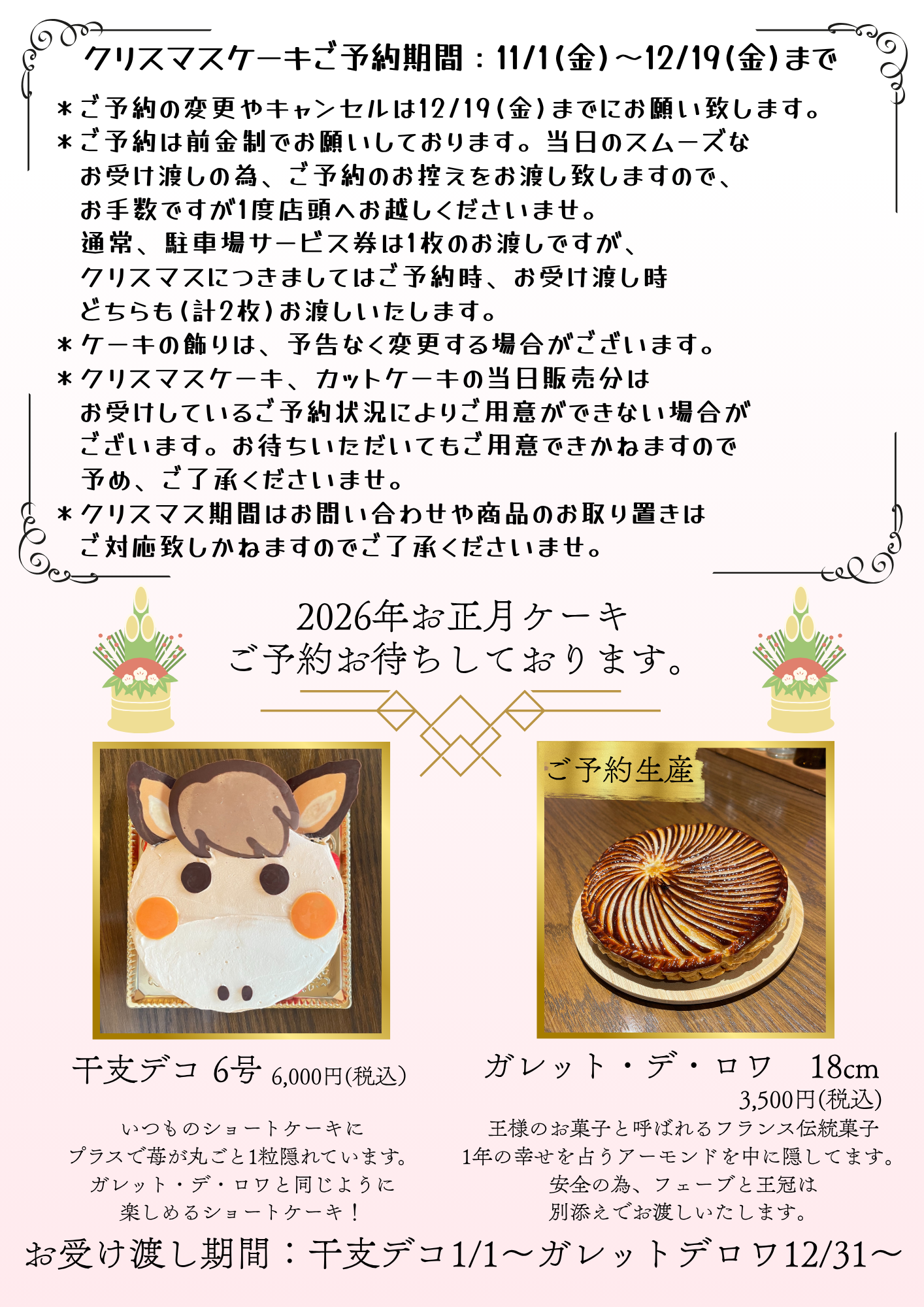 2025 年 11 月 10 日公開 Xmas ケーキ 2025年のクリスマスケーキのご案内です。ご予約は店頭前払いでお受けしております。お手数をおかけいたしますが、ご予約もれ防止の為、ご理解の程よろしくお願いいたします。また、2026年お正月向けのホールケーキ、ガレット・デ・ロワのご予約も同時にお受けしております。ぜひ、ご検討くださいませ。